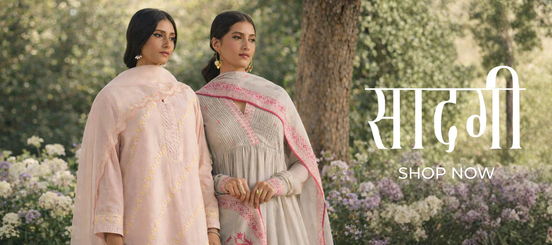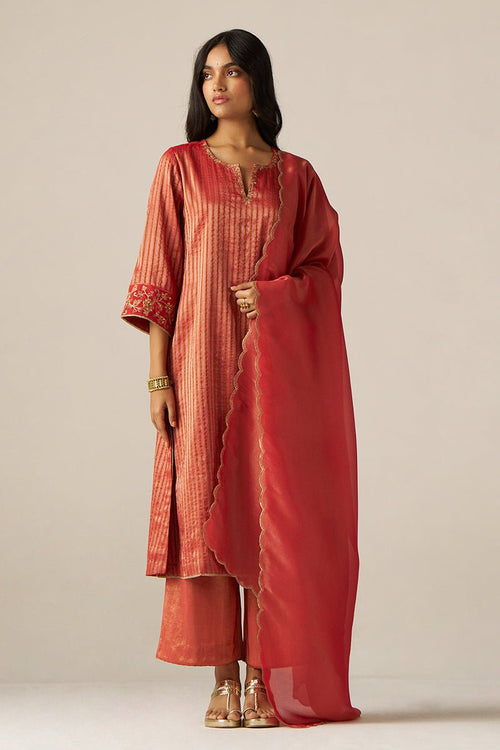 Beige and Pink Woven Kurta Suit Set With Delicate Hand Work Detailing